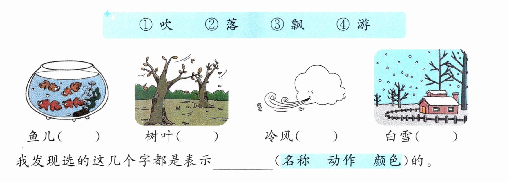 三、看图,选字填空,积累关于景物的短语(填序号),再发现规律。