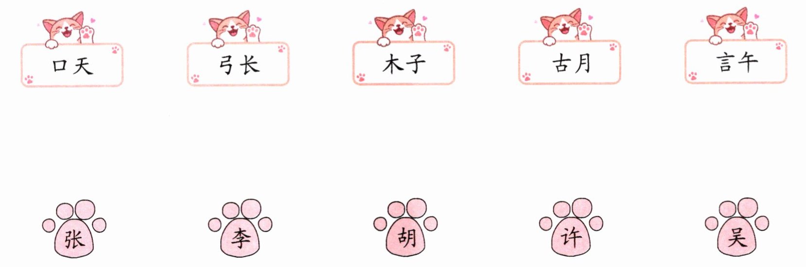 )答案:1. 六 李、张、胡、吴、徐、许 2. 李、张、胡、吴、徐、许 3. ④ 解析:①②③项都采用了拆字法,④项用偏旁来介绍姓氏。 4.(1)√ (2)× 解析:儿歌主要介绍了姓氏,没有探究姓氏的来历。
