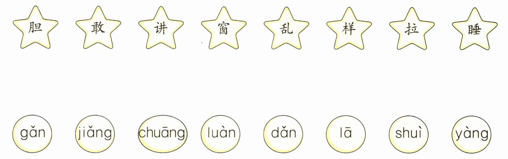 答案:胆——dǎn;敢——gǎn;讲——jiǎng;窗——chuāng;乱——luàn;样——yàng;拉——lā;睡——shuì。
