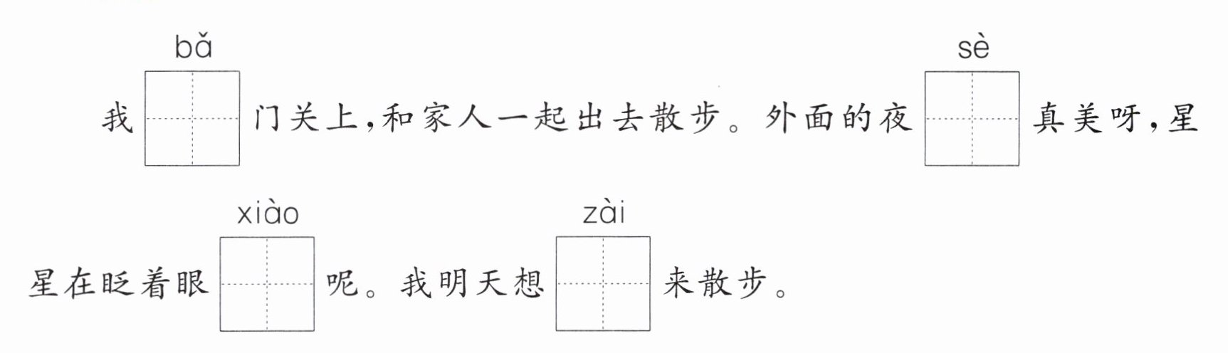 二、看拼音,写汉字,记下美丽夜景。