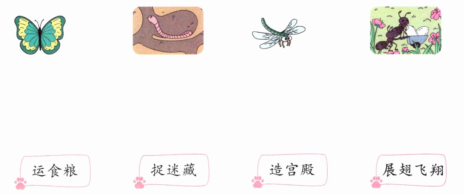 3. 蝴蝶——捉迷藏;蚯蚓——造宫殿;蜻蜓——展翅飞翔;蚂蚁——运食粮。