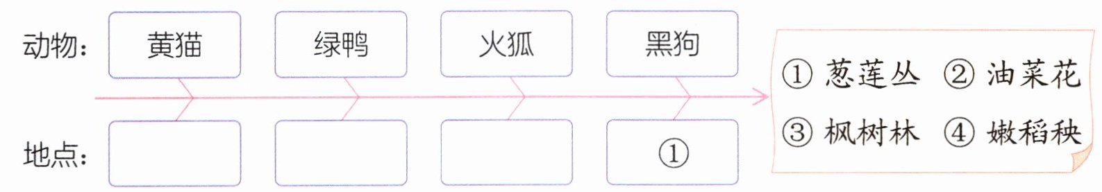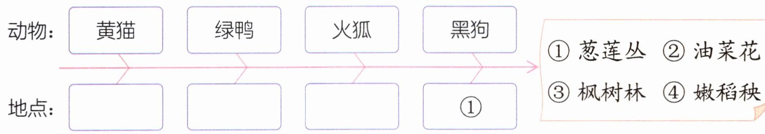 3.(思维导图)小动物们分别藏在了哪里?照样子填一填。(填序号)