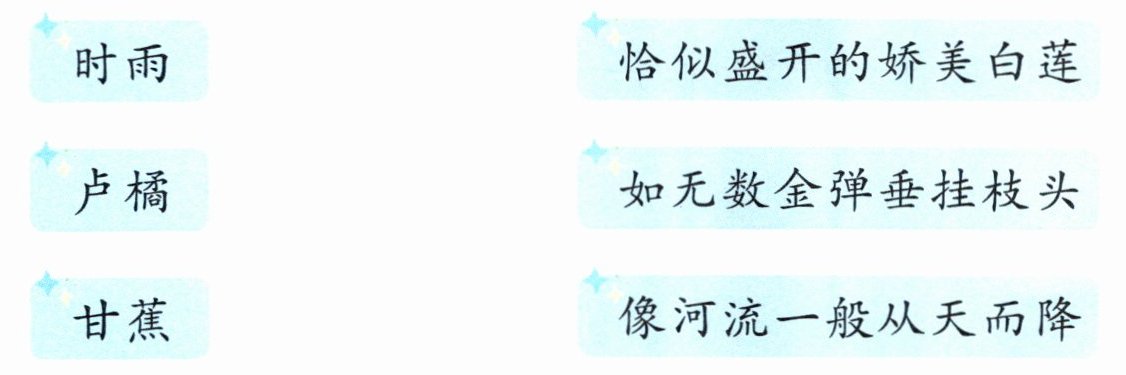 4. 时雨——像河流一般从天而降;卢橘——如无数金弹垂挂枝头;甘蕉——恰似盛开的娇美白莲