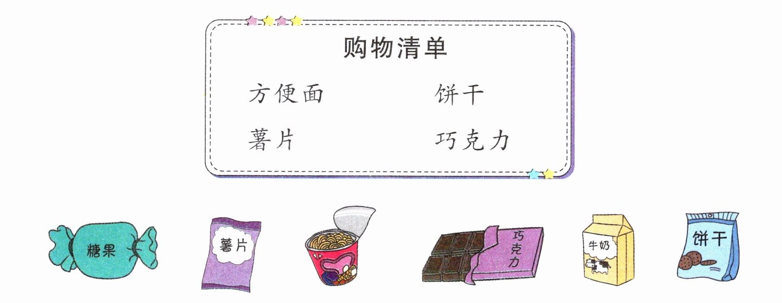 三、[采购物品]小语整理完发现还缺少一些物品,快和他一起去超市采购吧。