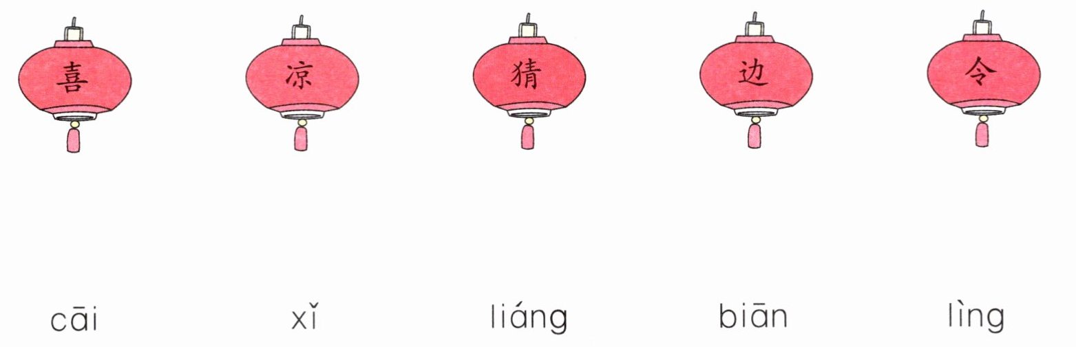 答案:喜——xǐ;凉——liáng;猜——cāi;边——biān;令——lìng。
