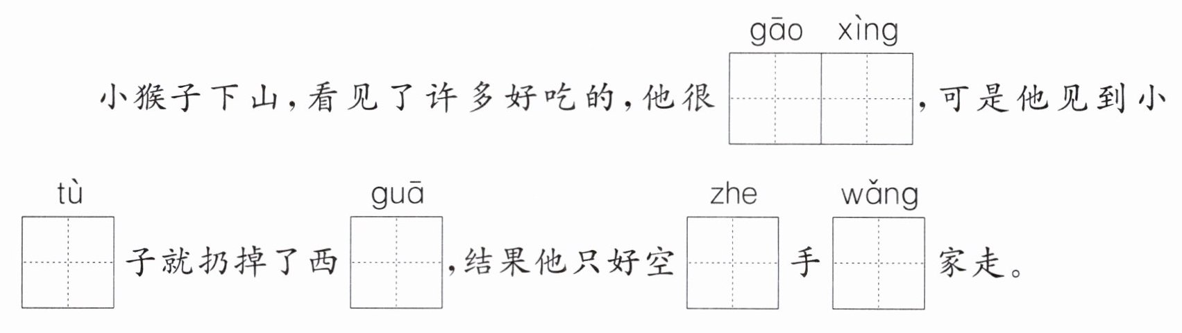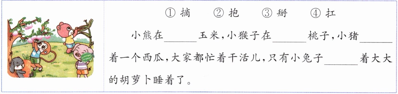 。答案:四、示例:小猪 一块西瓜地里 西瓜结得又大又圆 摘了一个 抱着回家了