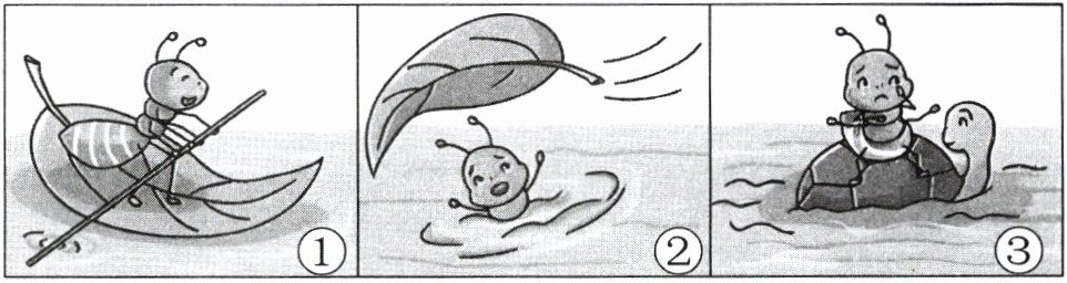 答案:示例:小蚂蚁想过河找朋友,就把绿叶当小船,拿小棍划呀划。可一阵风吹来,绿叶翻了,小蚂蚁扑通一声掉进水里,拼命扑腾。这时,小乌龟游过来,说:“快到我背上来!”小蚂蚁爬上龟背,感激地说:“谢谢你!”最后,在小乌龟的帮助下,小蚂蚁顺利过了河。