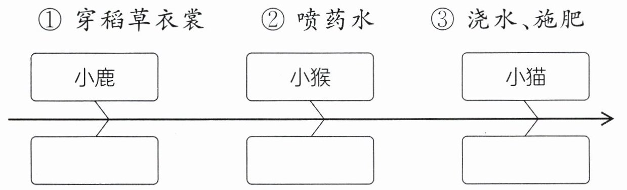 ① 穿稻草衣裳 ② 喷药水 ③ 浇水、施肥
