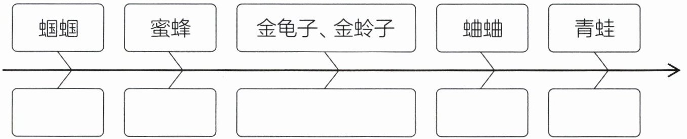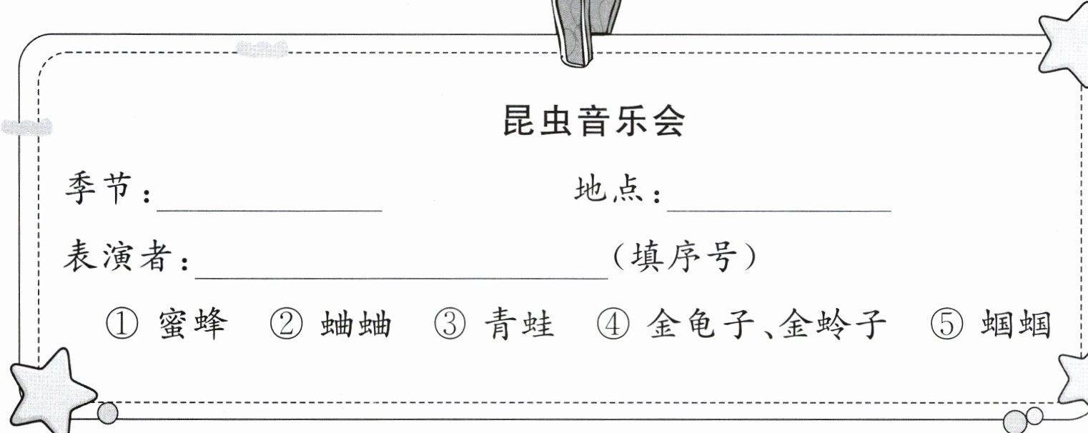 2. 夏天 草地上 ①②④⑤ 3. ② ① ④ ③ ⑤ 4. 青蛙也想来参加,可它不是昆虫类