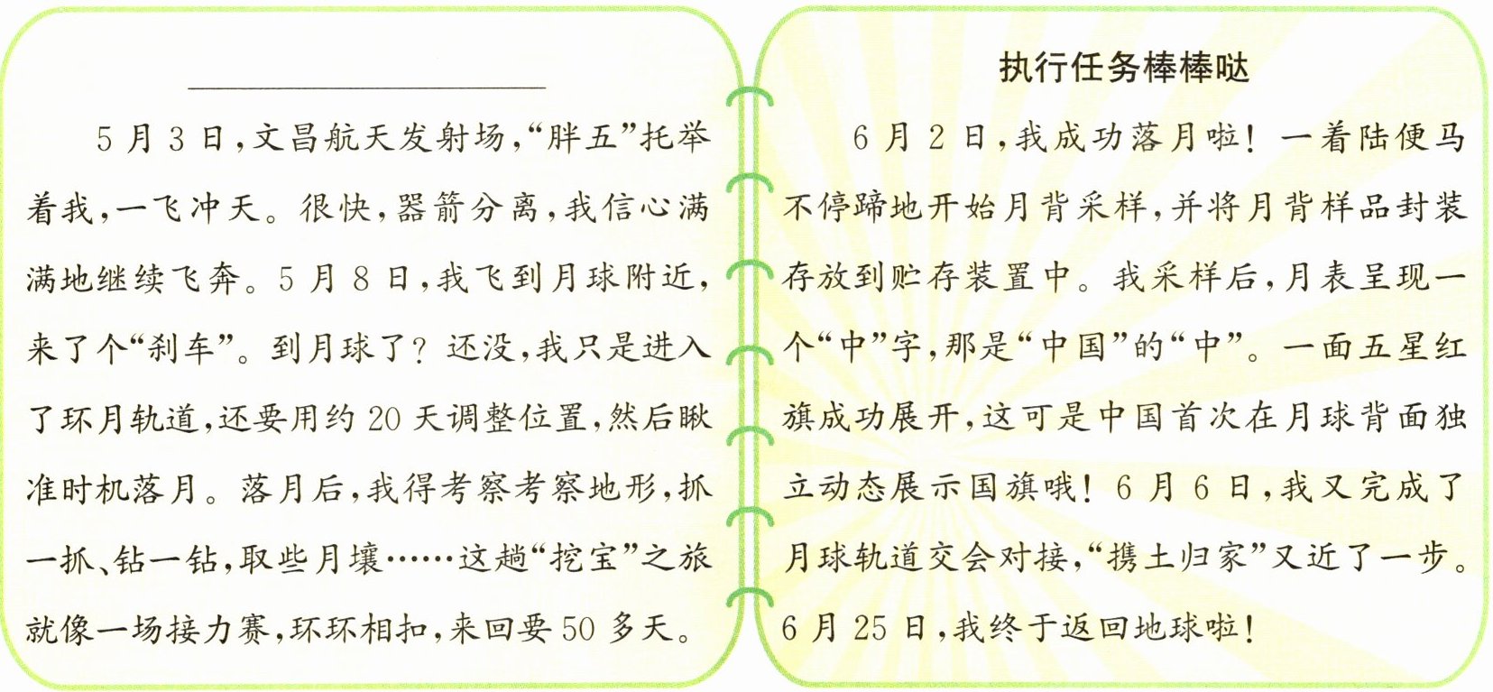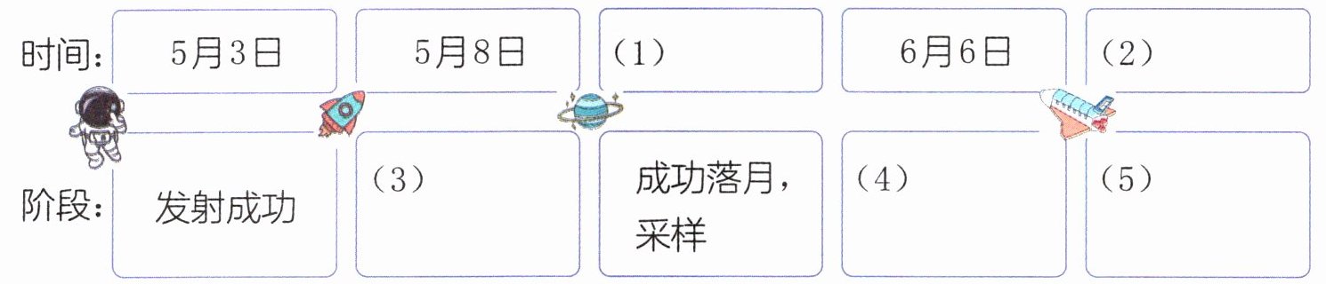 答案:二、1. 示例:信心满满地出发 2.(1)6 月 2 日(2)6 月 25 日(3)进入环月轨道(4)完成月球轨道交会对接(5)返回地球 3. 示例:① 完成月背采样后,月表呈现的“中”字有什么特殊含义?② 这次“挖宝”之旅来回一共需要多少天?② 这次“挖宝”之旅来回一共需要 50 多天。