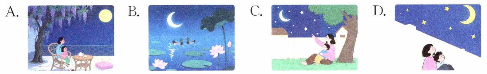 2. A 解析:A项画面呈现出夜晚“月明的园”、有植物(可对应“藤萝的叶”),还有孩子在“母亲的膝上”的温馨相处场景,完整对应诗中“永不漫灭的回忆”元素,贴合诗歌。