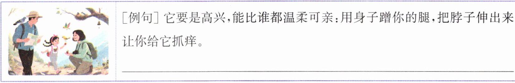 [例句] 它要是高兴,能比谁都温柔可亲:用身子蹭你的腿,把脖子伸出来让你给它抓痒。