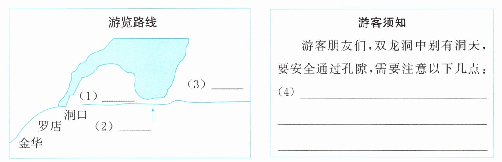 着船底了,才说一声“行了”,船就慢慢移动。眼前昏暗了,可是还能感觉左右和上方的山石似乎都在朝我挤压过来。我又感觉要是把头稍微抬起一点儿,准会撞破额角,擦伤鼻子。大约行了两三丈的水程吧,就登陆了。这就到了内洞。 (作者:叶圣陶)1.(教材课后习题变式)请根据片段内容,补全游览路线和游客须知。