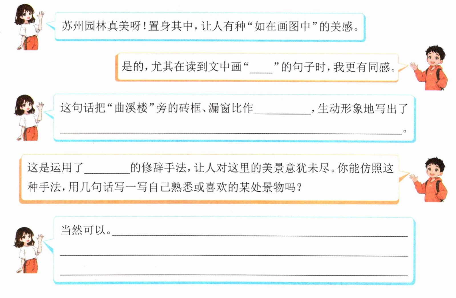 4. 读一读文中画“”的句子,把对话补充完整。