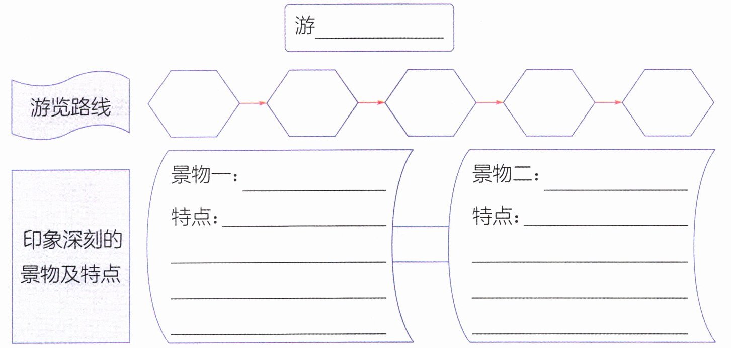 四、[学写法]根据游览图,按照示例中的游览路线,仿写过渡句。