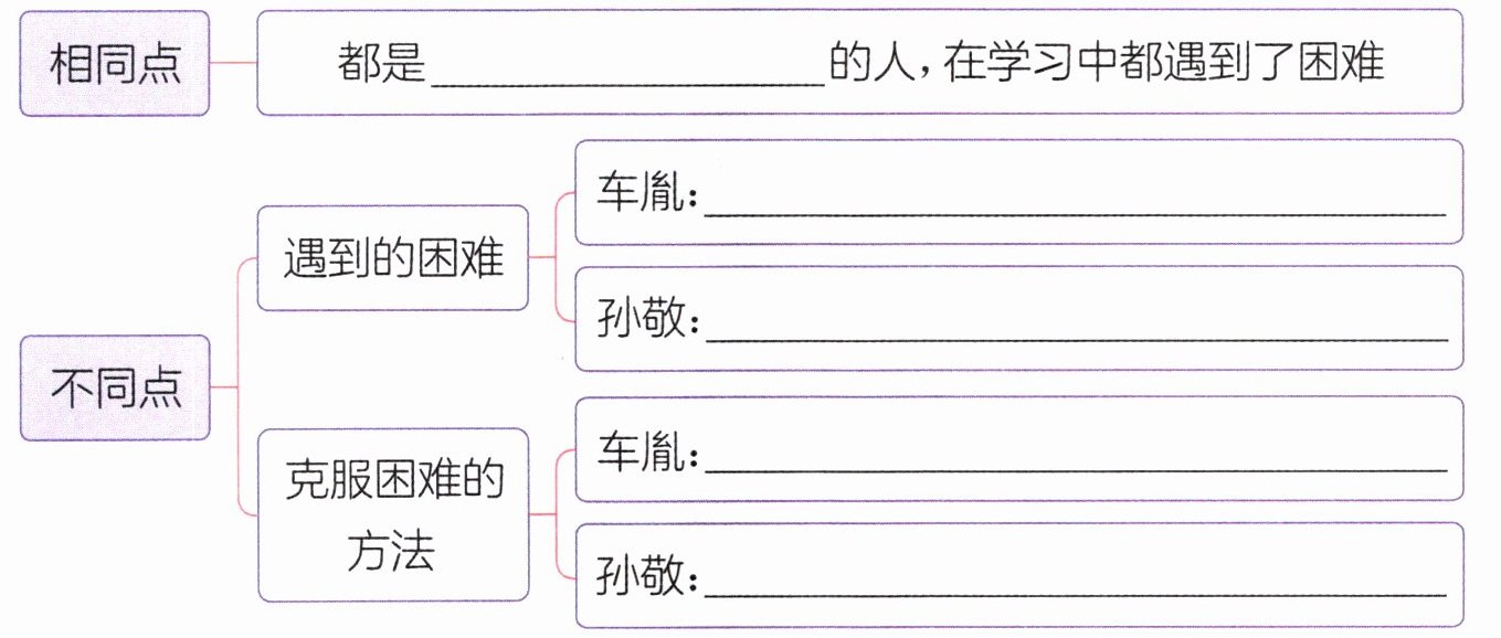 3. 勤奋好学 家贫不常得油 眠睡疲寝 练囊盛数十萤火以照书 以绳系头,悬屋梁 4. 示例:我觉得这个观点是错误的。我们现在生活好了,虽然不再用囊萤来照明,也不再用头悬梁的方法来使自己清醒,但这类故事是告诉我们要刻苦学习才能有所成就的道理,所以讲这类故事并不过时。