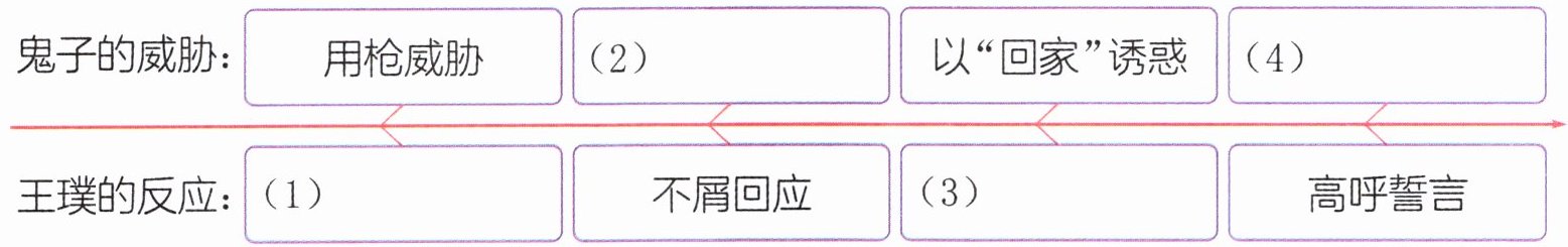 的品质。答案:1. 示例:日寇抓捕,王璞不屈 鬼子诱逼,王璞拒答 2. (1)紧握拳头(或:愤怒不屈) (2)用糖哄骗 (3)怒视鬼子(或:毫不畏惧) (4)抽刀威胁