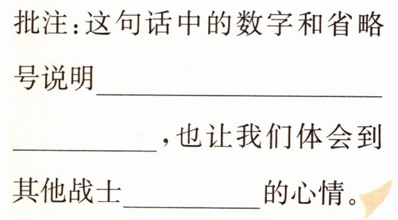 答案:1. ③④②⑤① 解析:本题考查对片段内容的理解。仔细阅读可知,片段是按照“身上负伤—顽强爬行—举起手雷—部队受阻—堵住枪口”的顺序来写的。 2. 黄继光每向前一步都很艰难 焦急 3. 赞叹 示例:为了战斗的胜利,为了祖国和人民,这点儿伤痛算什么?我必须坚持战斗! 解析:三个“!”连用,是对黄继光顽强意志的赞叹,突出了黄继光顶天立地的英雄形象,故应用赞叹的语气朗读。黄继光的想法应体现出他想完成任务的坚定信念。 4.(1)举起右臂 (2)火力点不断喷射火舌 (3)张开双臂、猛扑上去、堵住枪口 (4)英勇顽强、视死如归 5. 黄继光 示例:英勇无畏、视死如归 在上甘岭战役中,为夺下被敌人占领的 597.9 高地,黄继光冒着枪林弹雨去执行任务。他将生死置之度外,用自己的胸膛堵住了敌人的枪口,为战斗的胜利献出了宝贵的生命。