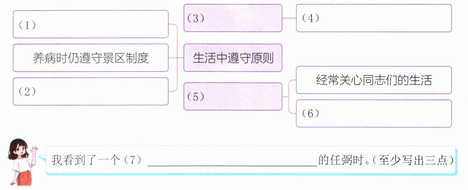 4. (思辨探究)小明当选了学校的大队委,朋友对他说:“成大事者不拘小节,在一些小事上可以放弃原则,灵活变通,为班级谋福利。”假如你是小明,请结合任弼时的故事向朋友说说你的看法。