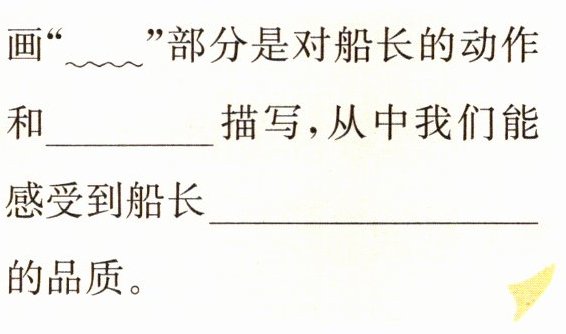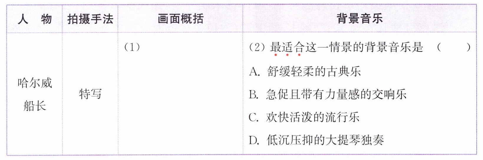答案:1. 人群混乱 轮机火炉直喘粗气 2. 尖叫 哭泣 惊慌失措 语言 临危不乱、忠于职守 3. 因为在灾难降临时,哈尔威船长就做好了与船共存亡的准备,所以他才会说把六十人救出去。 我从中体会到了他忠于职守、心系他人的美好品质。 4.(1)示例:哈尔威船长神情坚毅,站在指挥台上有力地挥舞手臂,大声下达救援命令。 (2)B 解析:A项,“舒缓轻柔的古典乐”营造的是悠闲宁静的氛围,与当时的紧急场景不符。B项,“急促且带有力量感的交响乐”能渲染危急氛围,让观众感受到时间的紧迫;力量感则可突出船长指挥时的果断与掌控力,与情节和人物形象高度契合。C项,“欢快活泼的流行乐”风格轻松愉悦,与“轮船遇险、众人待救”的沉重场景不符。D项,“低沉压抑的大提琴独奏”虽能体现紧张感,但过度强调压抑感,无法突出船长在危难中指挥的力量与希望,与船长临危不乱的形象不符。