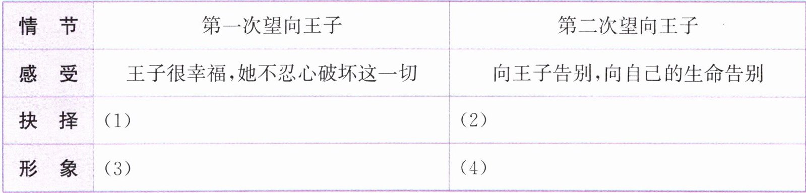 1. (阅读要素)结合小人鱼两次“深情地”望向王子的情节,完成表格。