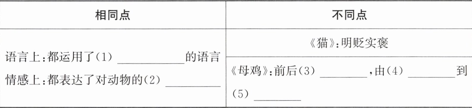 3. (对比阅读)《猫》和《母鸡》的作者都是老舍,两篇课文在表达上有相同之处,也有不同之处,将下面的表格补充完整。(5 分)
