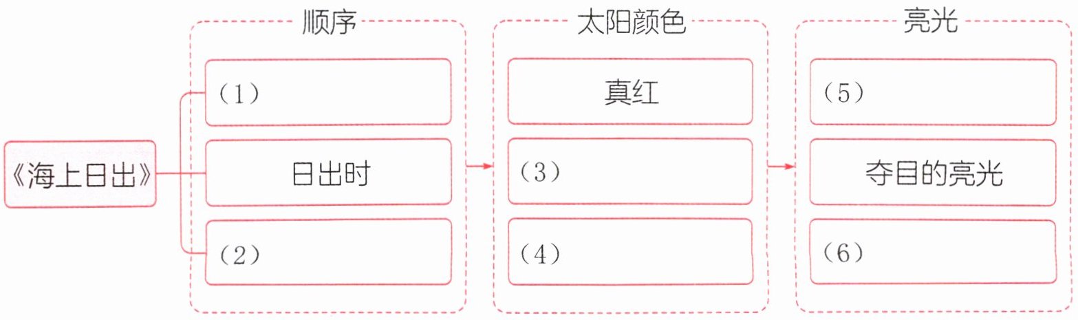 根据人教版语文四年级下册第五单元课文《海上日出》内容,作者按日出前、日出时、日出后的顺序描写。(1)处应填“日出前”;文中描写太阳升起时“发出夺目的亮光”,(5)处填“夺目”。