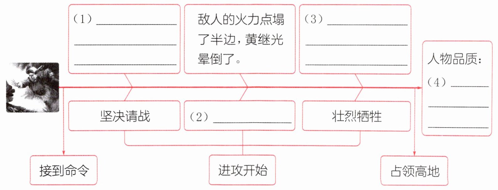 答案:五、(1)黄继光愤怒地注视着敌人的火力点,他转过身来坚定地对营参谋长说:“参谋长,请把这个任务交给我吧!”(2)摧毁半边火力点(3)他张开双臂,向喷射着火舌的火力点猛扑上去,用自己的胸膛堵住了敌人的枪口。(4)英勇顽强、视死如归