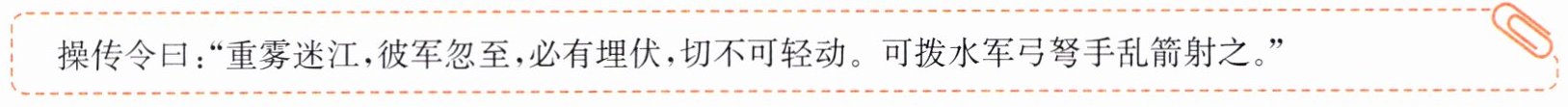 曹操得知江上的动静后,就下令说:“江上雾很大,敌人忽然来攻,必有埋伏,我们看不清虚实,不要轻易出动。拨水军弓弩手朝他们射箭便是。”