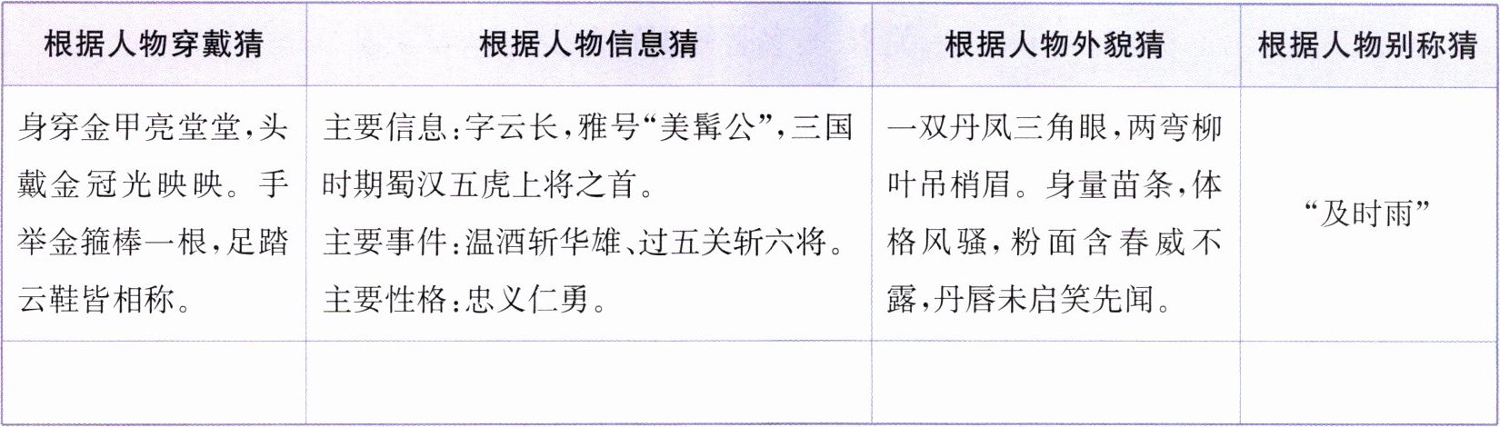 五、(南京六合区真题)阅读古典名著,大家认识了很多个性鲜明的人物。请根据下列线索猜出对应的人物,写在下面。