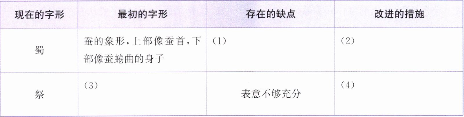 答案:五、1. 声符 形符 2.(1)与其他象形字的区分度不够大(2)增加部件“虫”,强化了它的类别(3)一只手杀牲祭祀,把血滴在盆里(4)增加了表示祭祀的部件“示”