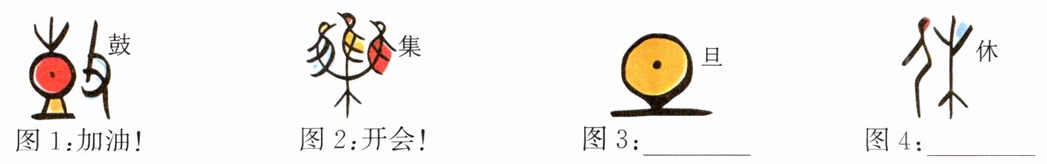 六、“甲骨文表情包”悄然流行,人们用它来进行当下生活的互动交流。比如图1用“鼓”表示“加油”,图2用“集”表示“开会”。请你为图3和图4赋予常用的交际意思。