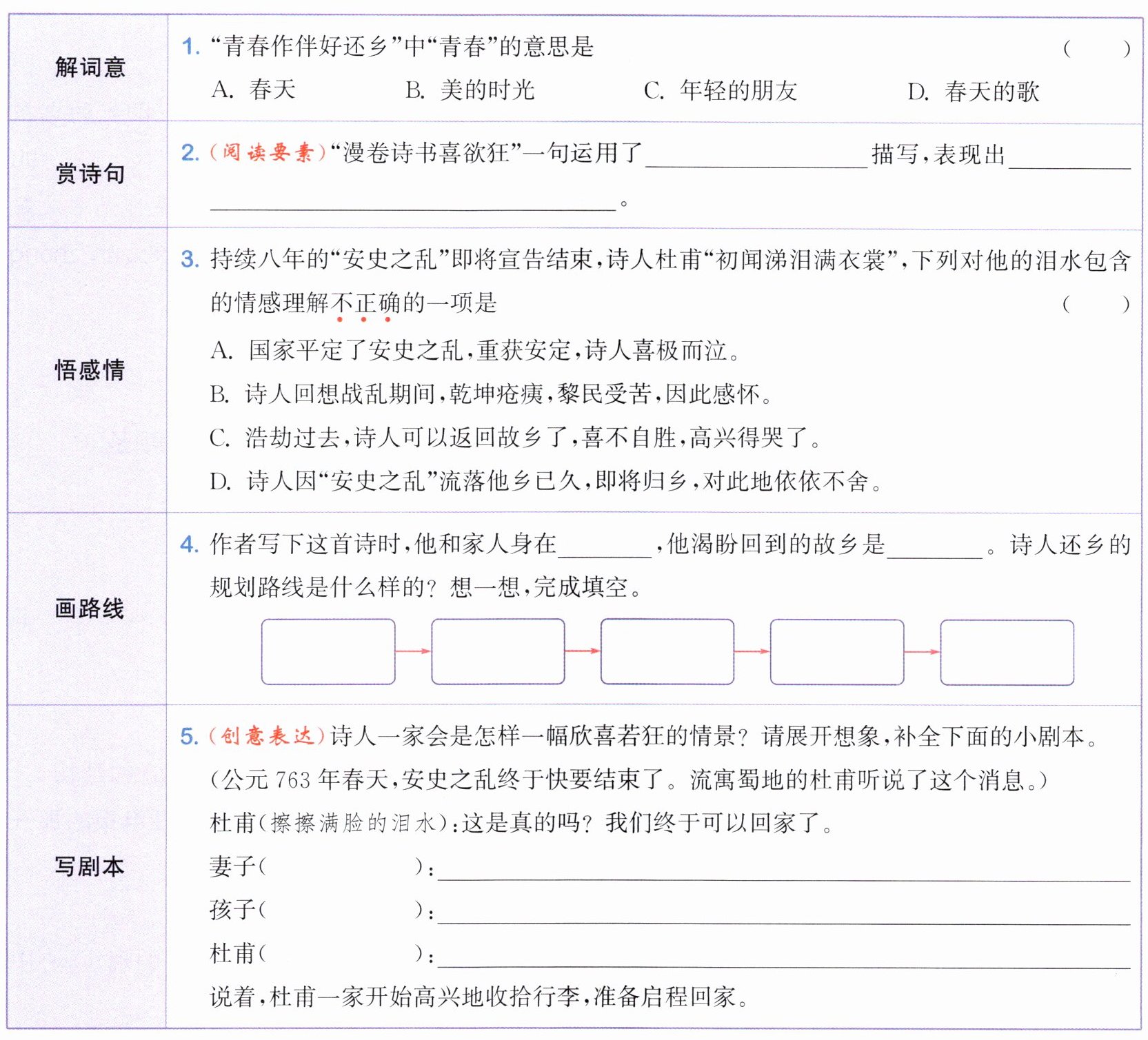 答案:1. A 解析:“青春作伴好还乡”意思是趁着明媚春光与妻儿一同返回家乡。青春指春天。