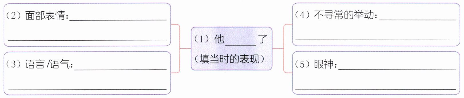 。答案:1. 生气 2. 神态 语言 动作 3. 示例:他扔枕头,踢被子,面目狰狞。桌子上的台灯被他狠狠地摔在地上,灯泡碎了,玻璃碴子落了一地。 “扔”“踢”“摔”三个连续性动作带来的力量是巨大的,表现出人物愤怒至极