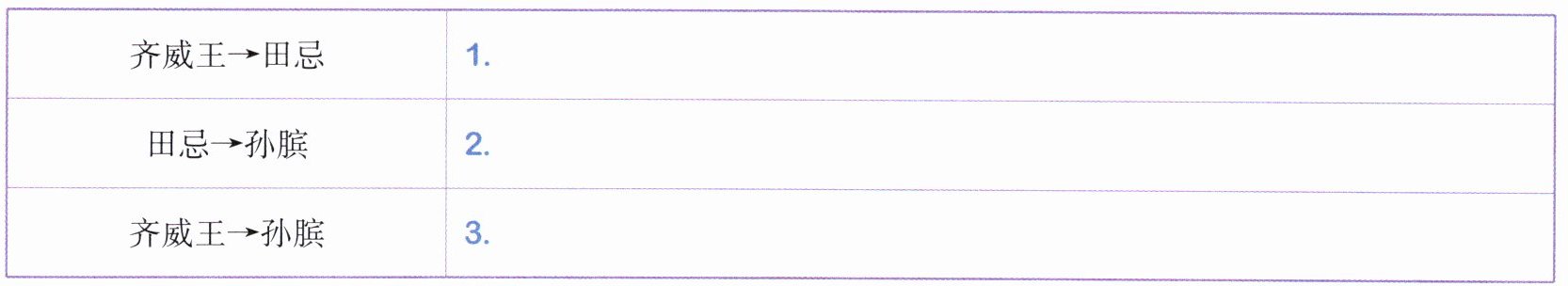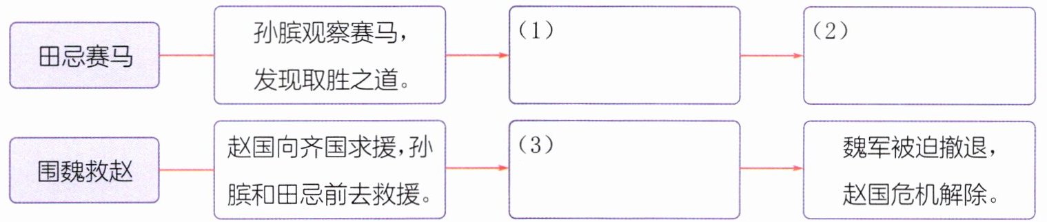 答案:1. (1) 田忌改变马的出场顺序。 (2) 田忌赢了齐威王。 (3) 田忌和孙膑带领齐军向大梁进军。