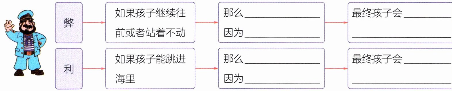 。(不超过8个字)答案:1. 示例:孩子十分危险 孩子在高高的横木上,随时都有可能摔倒在甲板上 受到严重的伤害 孩子相对安全 水手可以及时下水救人 及时得救 沉着镇静、机智果断 2. 哭笑不得 气极了