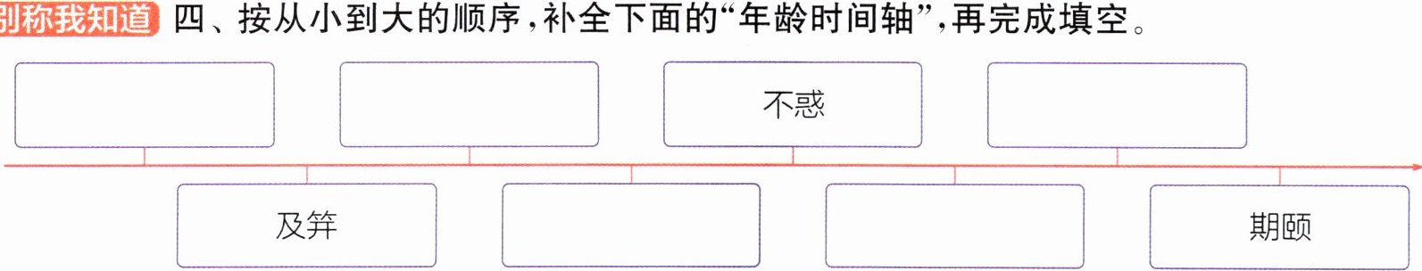 四、按从小到大的顺序,补全下面的“年龄时间轴”,再完成填空。