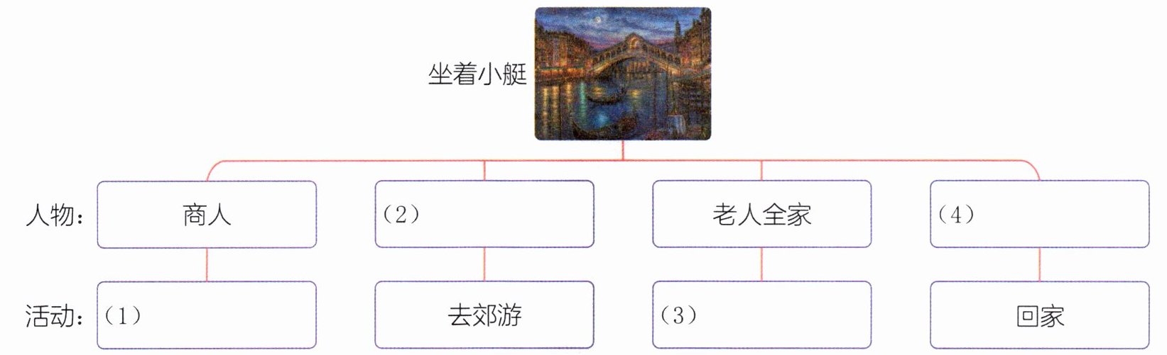 。 (作者:[美国]马克·吐温 译者:刘正训)1. (思维导图)阅读第②③自然段,梳理信息:谁乘坐小艇去做什么?完成思维导图。