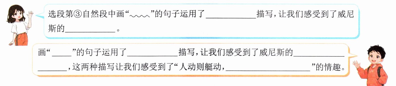 答案:1. 长 窄 深 船头和船艄向上翘起 轻快灵活 2. 能让读者更直观形象地了解威尼斯小艇的外形和行动特点,将陌生事物变得通俗易懂,易于让人在脑海中形成画面。 3. 示例:湖面平静得像一面镜子,绿得像一块翡翠。