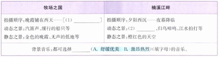 答案:1.(1)最后一抹晚霞消失(2)牛群牧归 A 2. 示例:B 这句话把夕阳西沉比作被无形的手按入山峦怀抱,生动地写出夕阳西沉的动态美与天空绚丽的色彩,让画面浪漫又有诗意,蕴含着奇妙的想象。