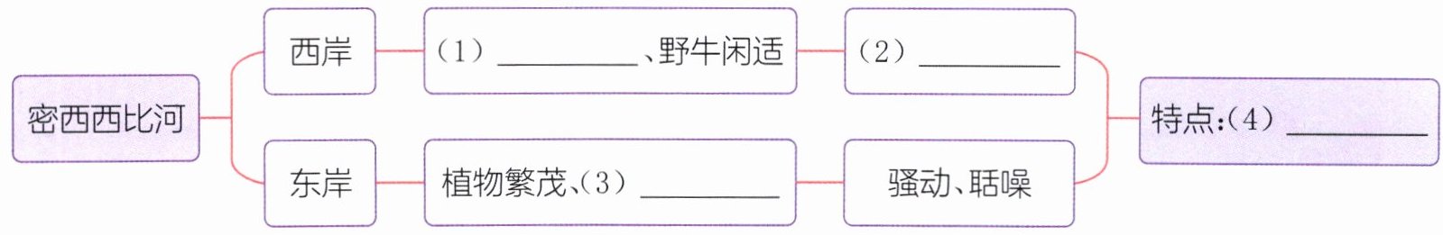 1.(思维导图)密西西比河两岸的风光主要有什么不同?阅读文章,完成下面的思维导图。