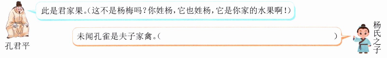 铺好语言积累瓦 二、语言的趣味藏在字里行间。请先补全孔君平和杨氏之子的对话,再完成练习。