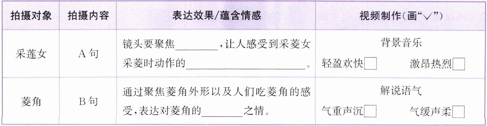 3.(阅读要素)结合第②自然段的内容,补全下面的镜头拍摄单。