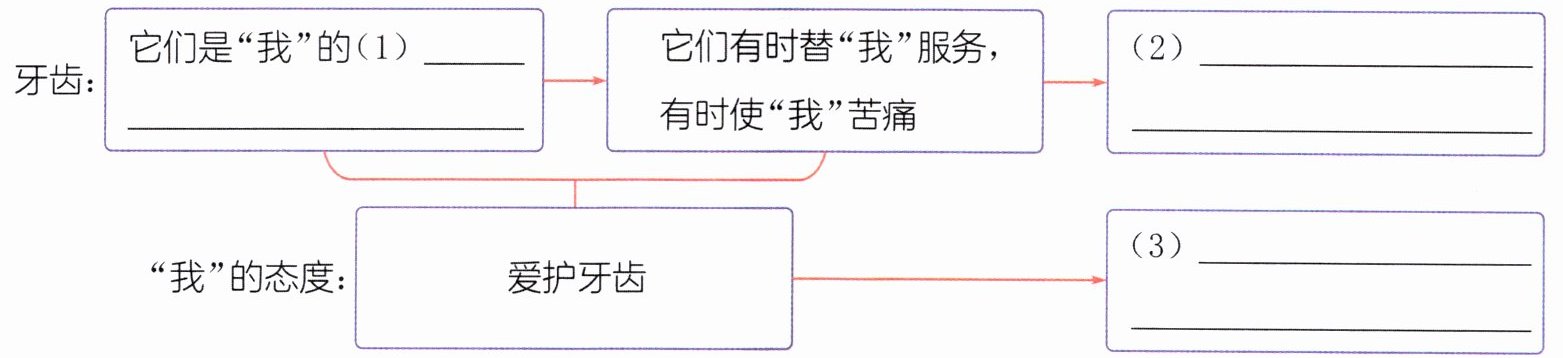1. (思维导图)在本文中,牙齿是怎样一步步“作恶”的?“我”对牙齿的态度又是怎样变化的?完成下图。