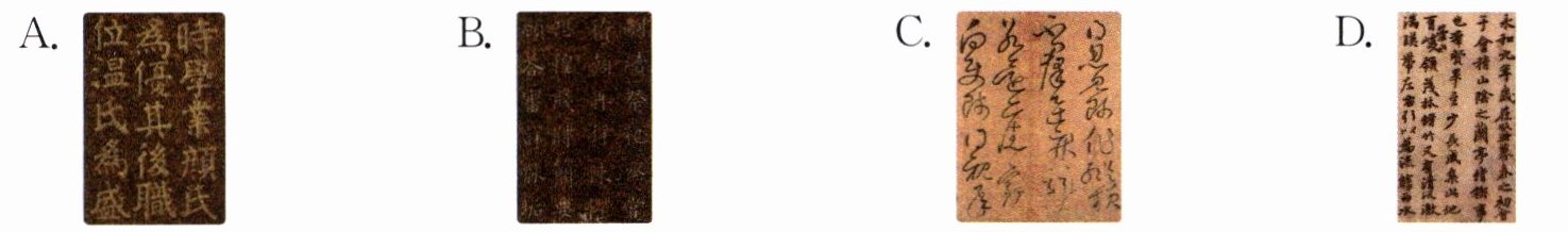 )答案:三、A 解析:颜真卿楷书的特点是恢宏雄壮、大气磅礴,筋肉丰满、浑厚有力。A 项的字体风格符合颜真卿楷书特征,B 项字体风格更趋近于规整严谨,C 项是草书,D 项是行书,均不符合颜真卿楷书特点。