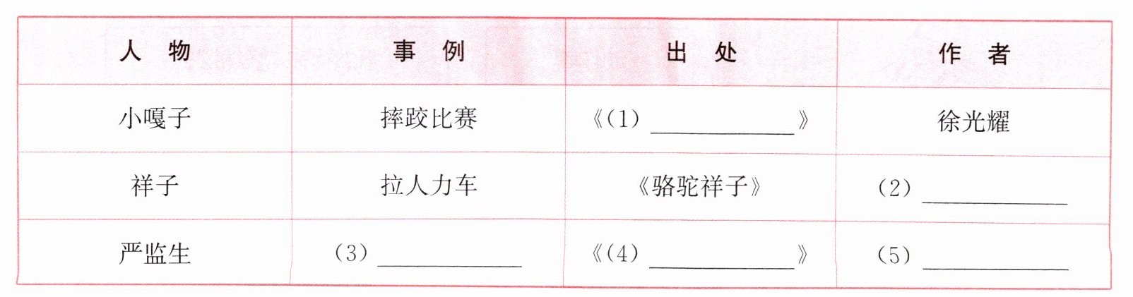 答案:六、(1)小兵张嘎 (2)老舍 (3)临死时仍惦记节省灯油 (4)儒林外史 (5)吴敬梓