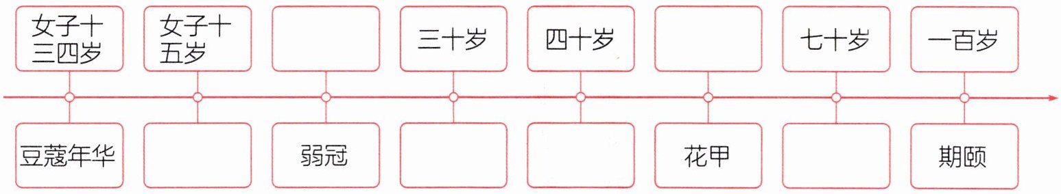 四、古人称年龄时,有时不用数字,而是用其他的一些称谓来表示。先补全下图,再用第二行内容填空。