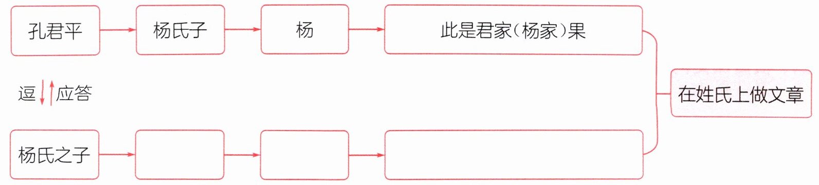 答案:四、示例:1. 梁国一户姓杨的人家有个九岁的孩子,非常聪明。 2.(孩子)给(孔君平)端来了水果,其中有杨梅。 3. 孔君平指着杨梅给孩子看,并说:“这是你家的水果。” 4. 孩子马上回答说:“我可没听说孔雀是先生您家的鸟。”
