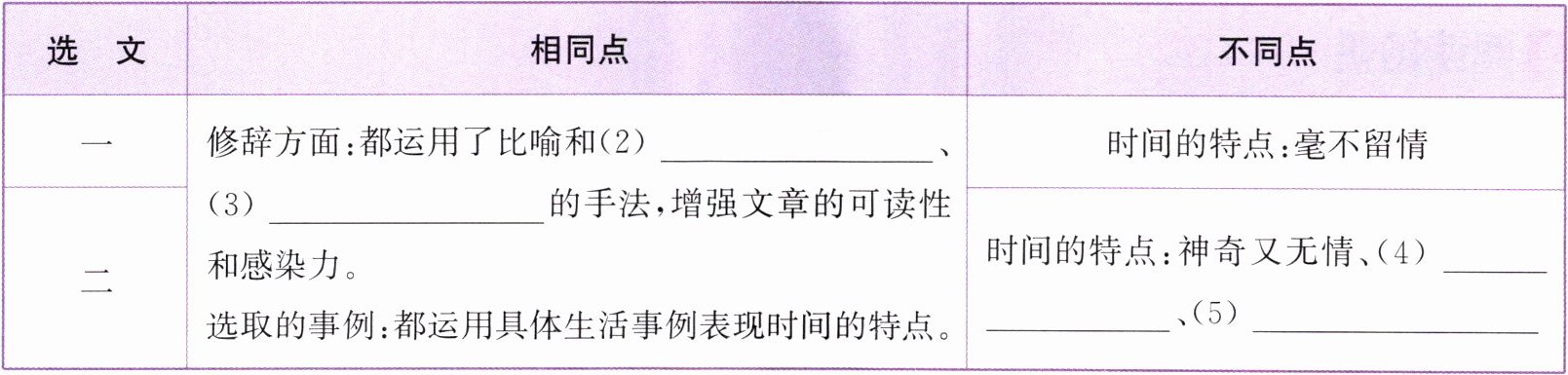 4.(对比阅读)两篇选文都表达了作者(1)。在表达情感的方式上,两篇选文有哪些相同点和不同点?对比阅读,将表格补充完整。