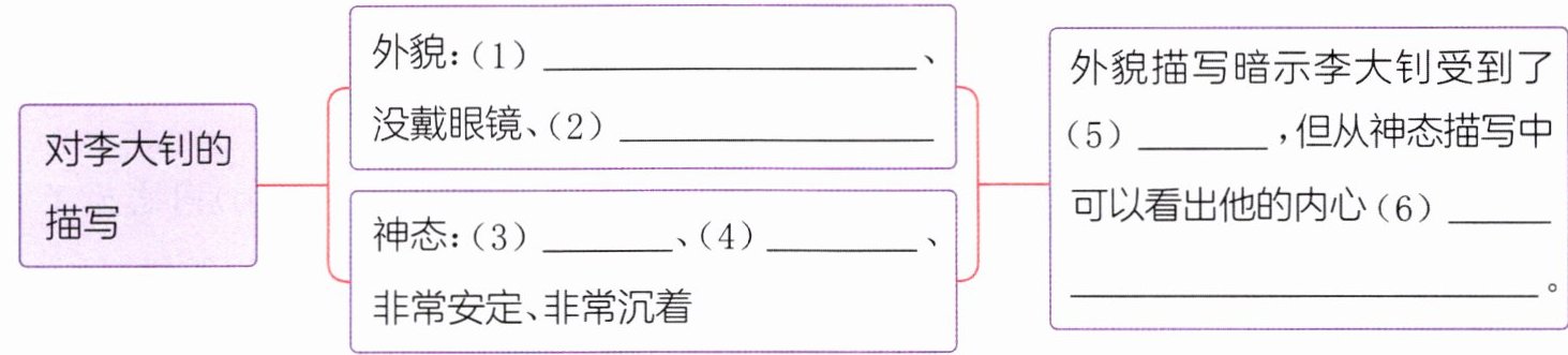 1. (阅读要素)阅读选段,找出描写李大钊外貌和神态的内容,填写思维导图。